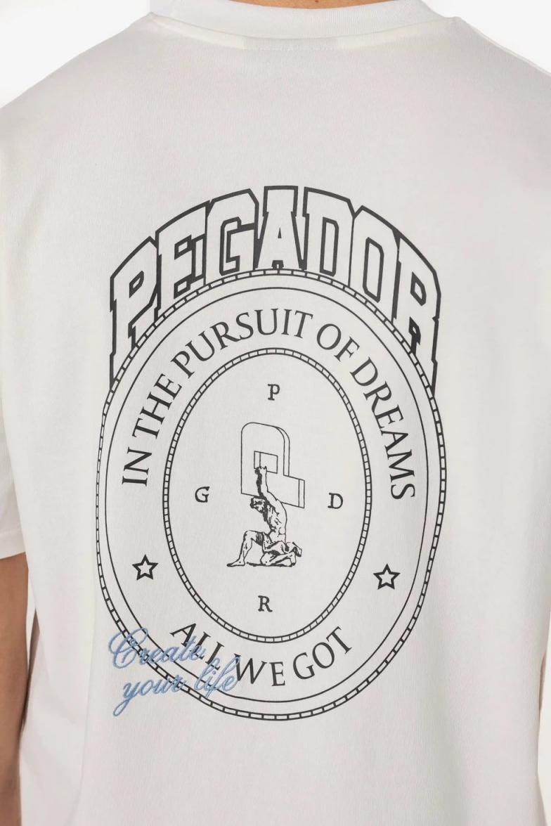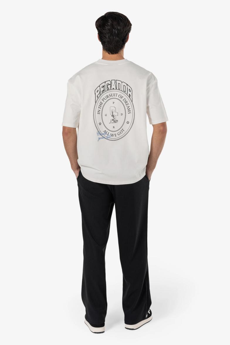 warm weißes T-Shirt oversized Fit fallende Schultern schwarzer Logo-Print auf der Vorderseite schwarzer Text & Artwork Print auf der Rückseite spring blue-farbiger „Create your life“ Text-Stick auf der Rückseite 260 gsm